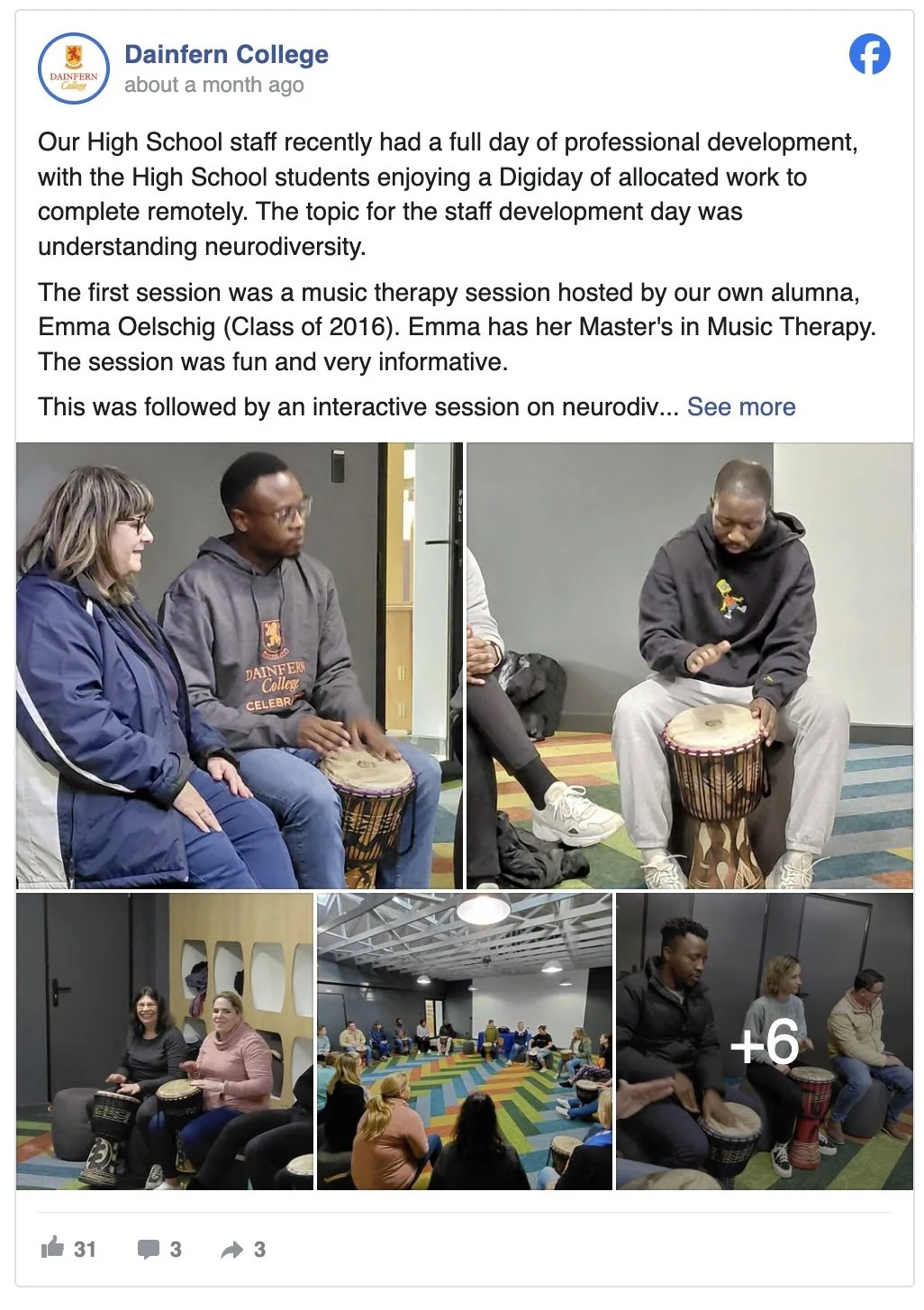 "Our school’s pastoral care team spent the morning with music therapist Emma Oelschig at our annual conference last week. From the drumming circle to the quieter reflective art space, the team had an incredible experience. The drumming brought us together with much fun, laughter, and some rhythm in between, and the guided quiet time allowed for space to breathe and reflect. Our team spends a great deal of time caring for others, so this quiet time for ourselves was greatly appreciated. Emma’s gentle presence and expertise allowed the team to feel safe and cared for as they took time for fun, team bonding, and quiet reflection time."